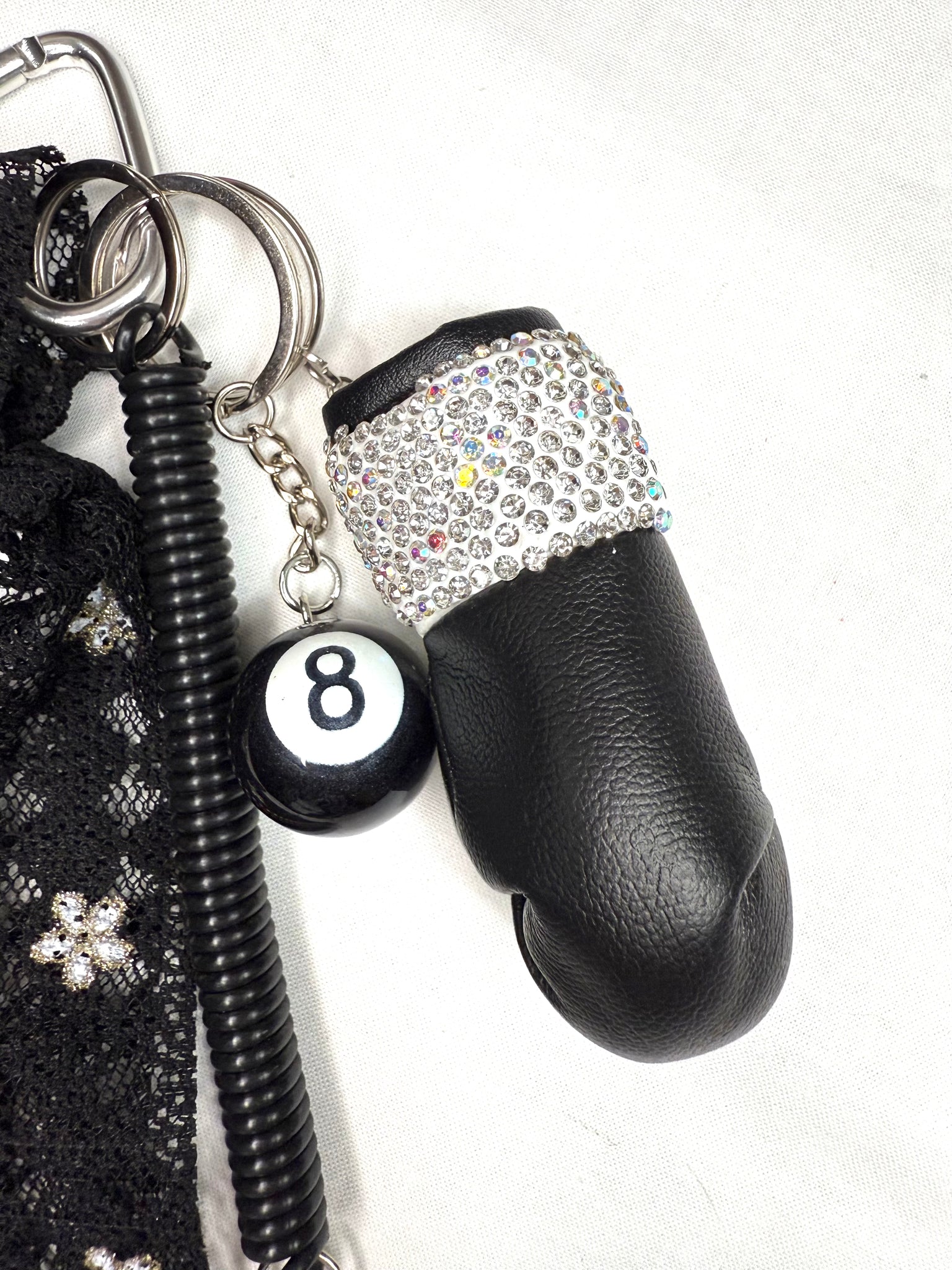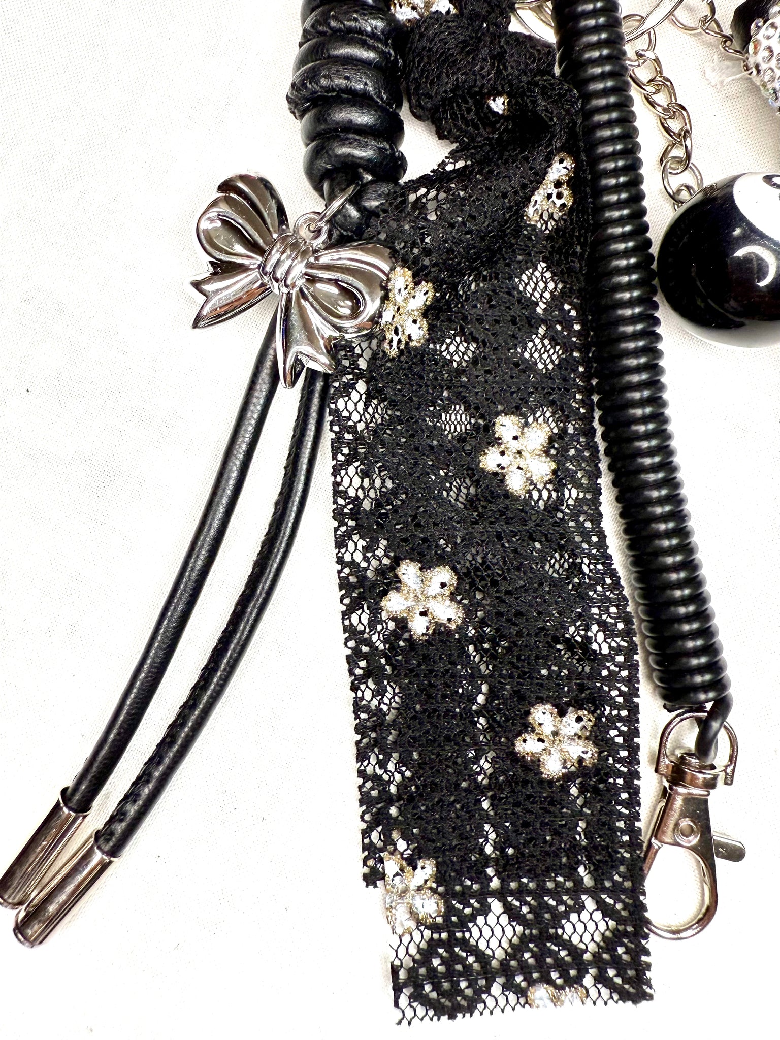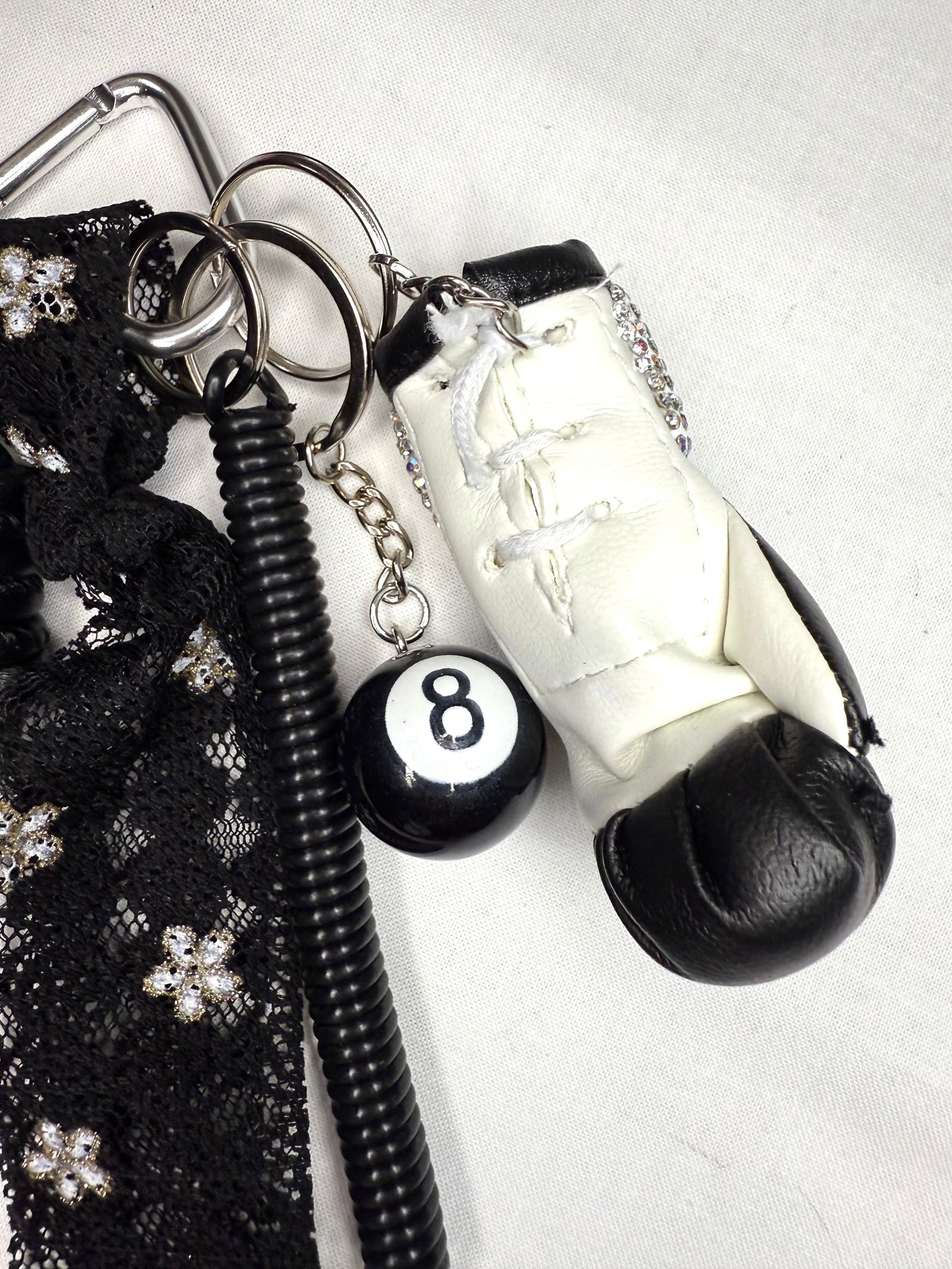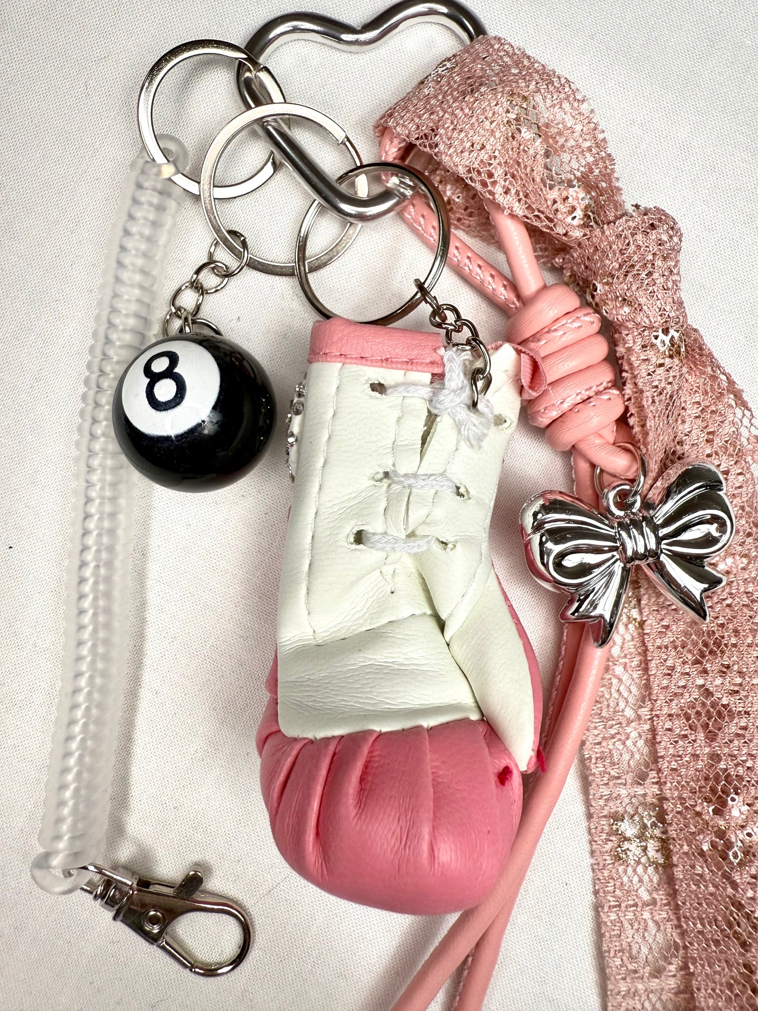 These bag charm keychains are a great mix of items. They feature a faux leather boxing glove, laced up, with crystal trim. A strip of lace with flowers on it, a stretchy coil keychain, and a faux leather cord with a silver bow attached. They are all connected to a heart shaped carabiner. You can attach it as a bag charm or remove them from the carabiner and use them individually. These fun and beautiful charms will stand out on your key ring or attached to your purse/handbag/backpack. They are very lightweight and trendy.