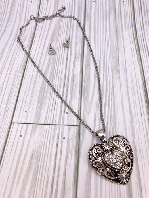 Silver Color Filagree Heart and Rhinestone Necklace Set