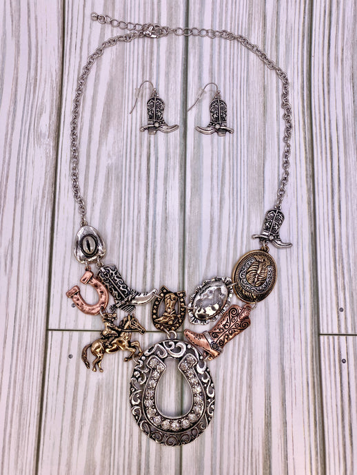 Western Charms Necklace Set with Rhinestone Horseshoe on Silver