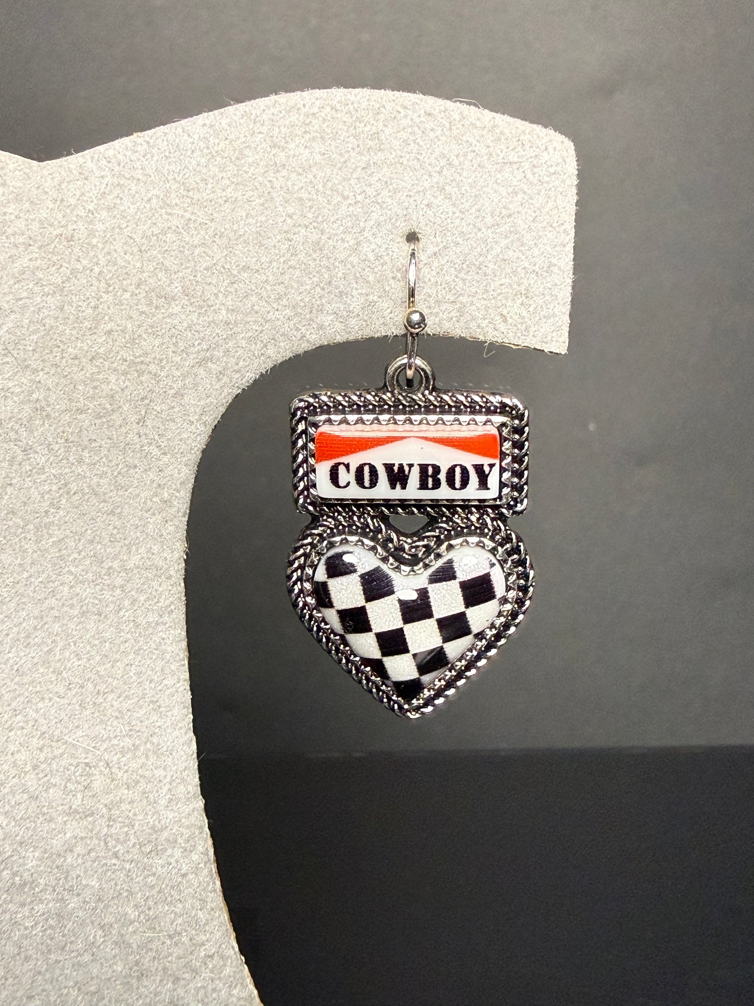 Cowboy earrings add a bold western edge to your look. They feature a silver-tone frame around a black and white checkered heart with a pop of red detail. These earrings are a fun mix of rodeo and retro vibes. Weighing 1 ounce each, they make the perfect standout accessory for any outfit.