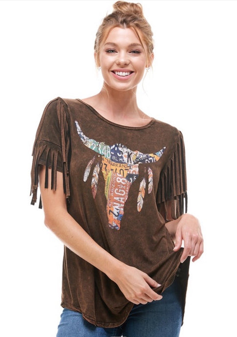 Mineral Washed License Plate Bull Skull Fringe Top